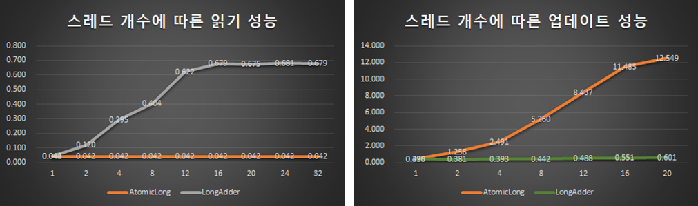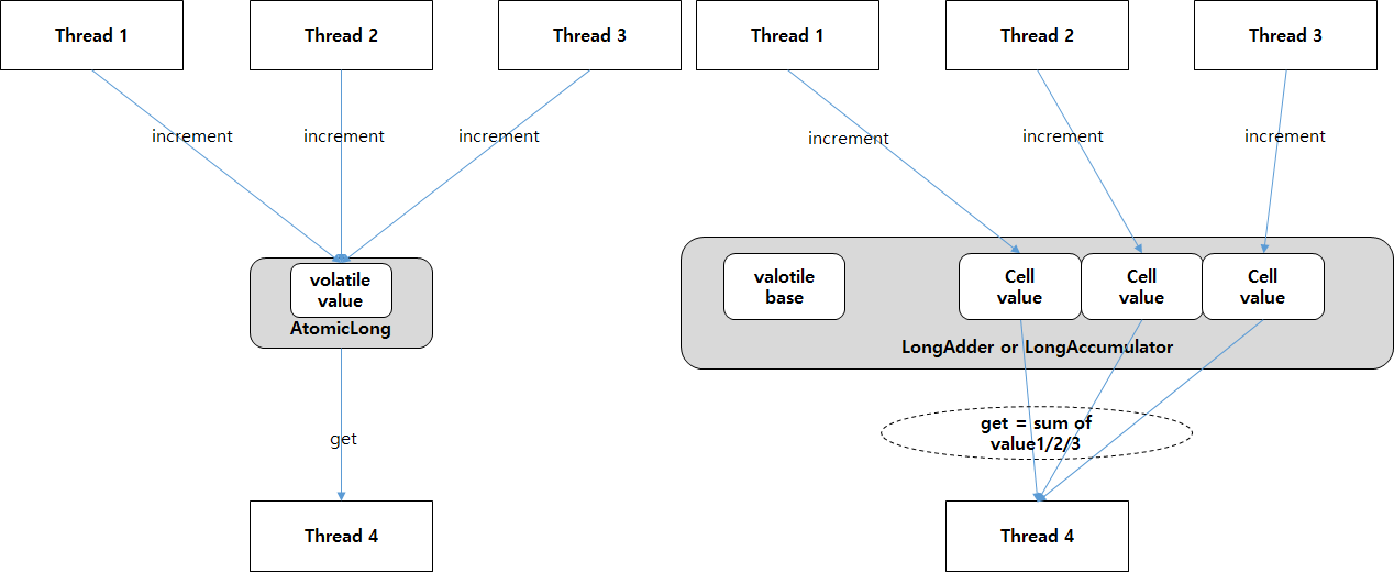 ๊ทธ๋ฆฌ๊ณ Base ๋ณ์๋ฅผ CAS ๋ฐฉ์์ผ๋ก ์ฝ๋ค๊ฐ ๋ง์ฝ ์คํจํ๋ค๋ฉด while(...)๋ก ๋ฐ๋ณตํ๋๊ฒ ์๋๋ผ ์ค๋ ๋ ๋ณ๋ก Cell ๋ฉ๋ชจ๋ฆฌ์ ๋ณ๋์ ์ฐ์ฐ์ ์งํํ๋ค. ๊ทธ๋ฆฌ๊ณ ๋์ ์ต์ข ์ ์ผ๋ก ๊ฐ ์ค๋ ๋์ ๊ฐ์ ํฉ์ณ ๊ฒฐ๊ณผ๋ฅผ ๋ฐํํ๋ ๋ฐฉ์์ด๋ค.