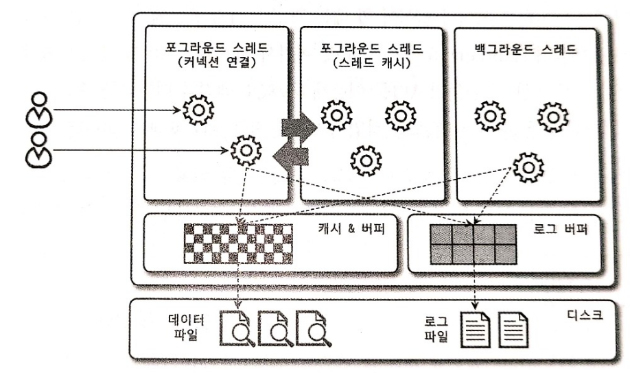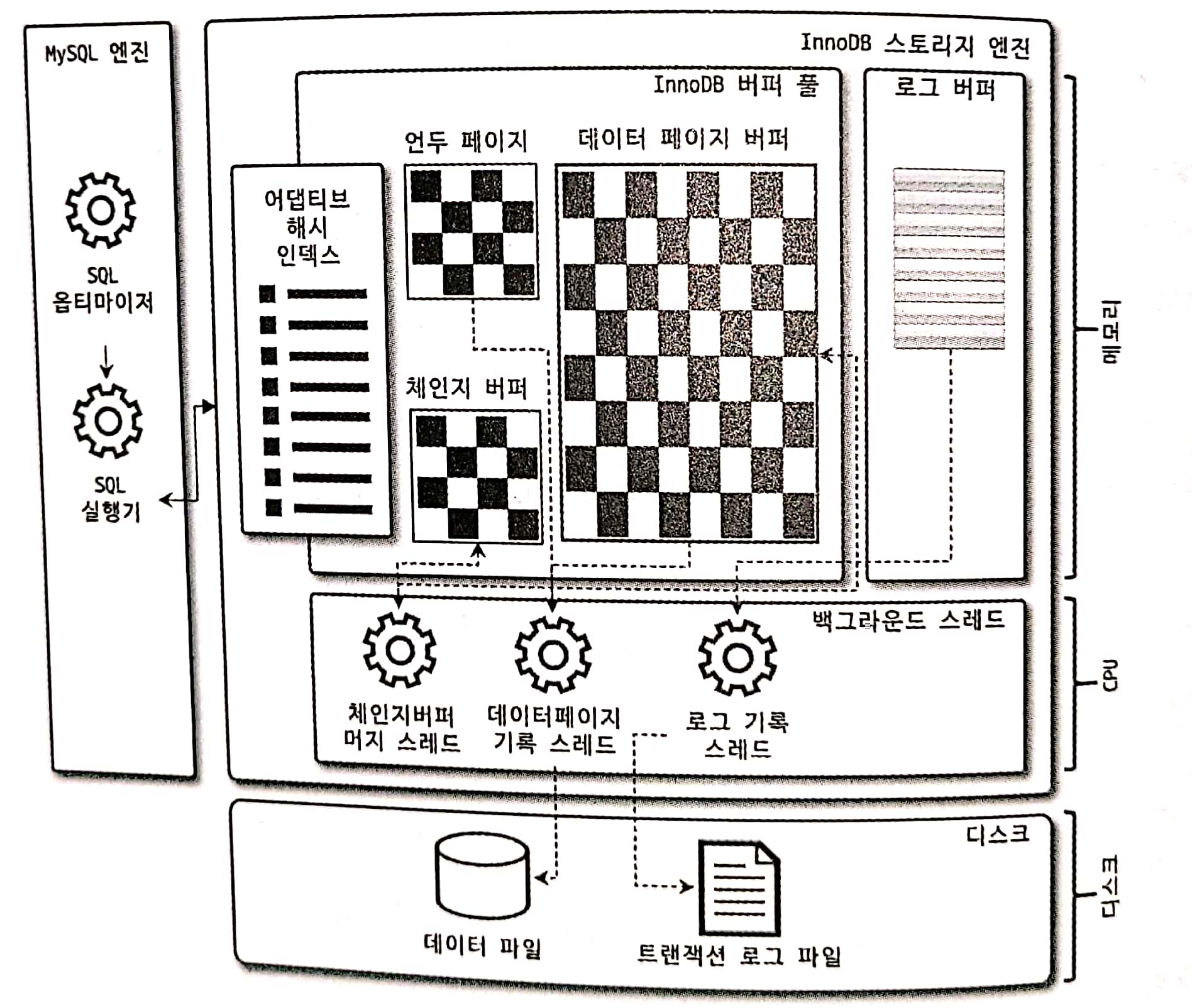 ํ์ง๋ง InnoDB ์์ง์ ์ญํ ์ด ํ์คํ๊ฒ ๋ถ๋ฆฌ๋์ด, ๋๋ถ๋ถ์ ์ฒ๋ฆฌ๋ ๋ฐฑ๊ทธ๋ผ์ด๋ ์ค๋ ๋๊ฐ ๋ด๋นํ๋ค.