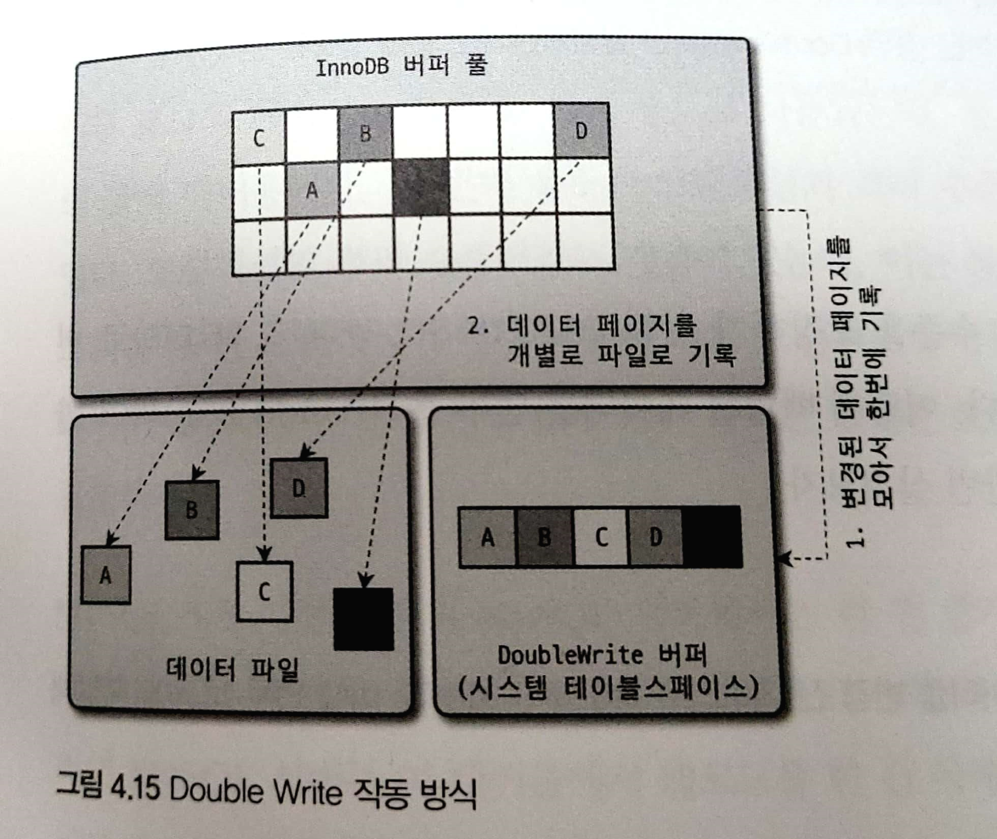 ๋ค๋ง SSD์ ๊ฒฝ์ฐ ๋๋ค I/O์ ์์ฐจ I/O ๋ ๋ค ๋ถ๋ด์ด ๋๊ธฐ ๋๋ฌธ์ ๋ฐ์ดํฐ ๋ฌด๊ฒฐ์ฑ์ด ์ค์ํ ๊ฒฝ์ฐ์๋ง innodb_doublewrite ๋ณ์๋ก ํด๋น ๊ธฐ๋ฅ์ ์ฌ์ฉํ๋ ๊ฒ์ด ์ข๋ค.