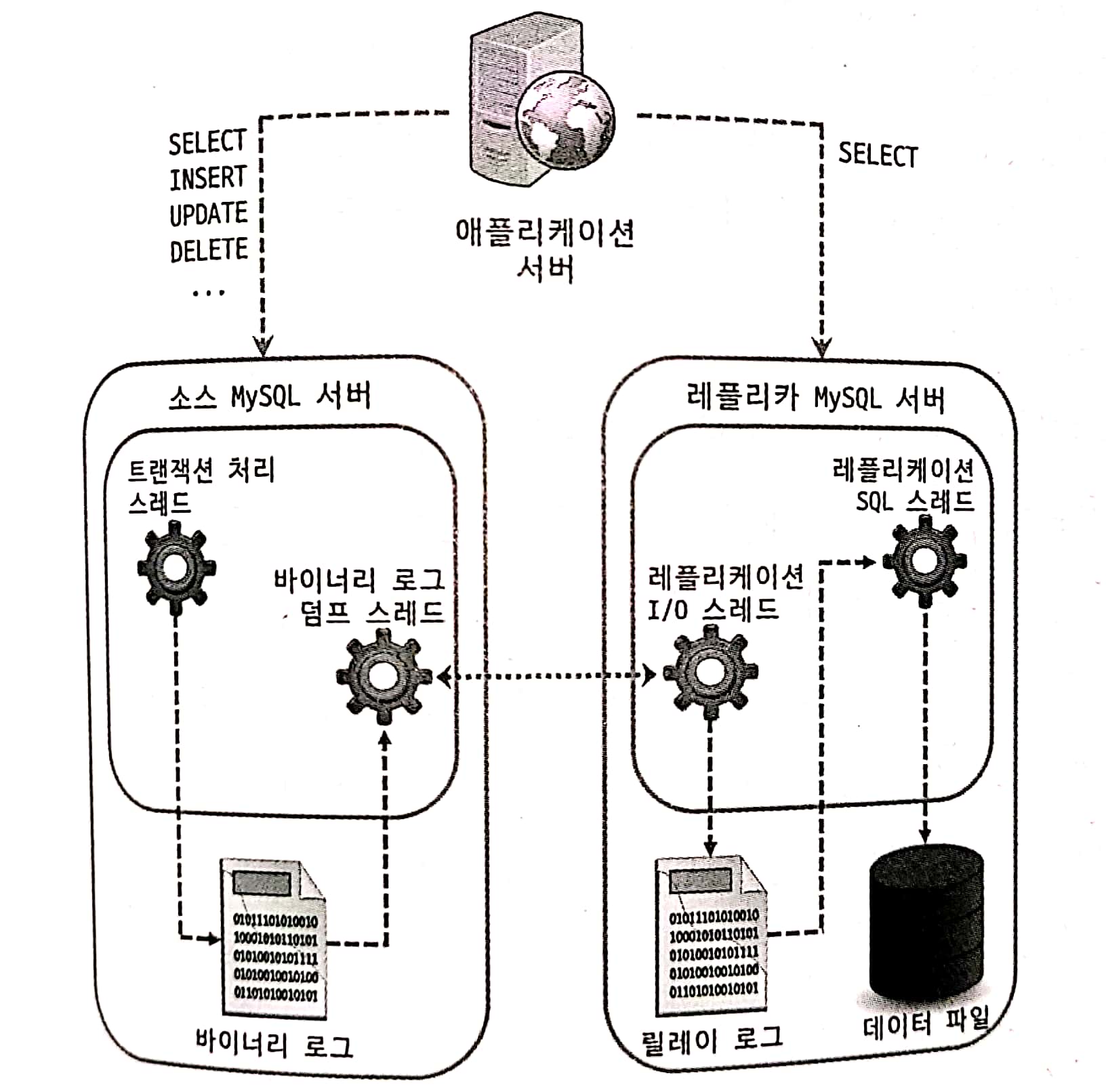 ์ด ๋ Primary์์ ๋ฐ์ด๋๋ฆฌ ๋ก๊ทธ ๋คํ ์ค๋ ๋ (Binlog dump thread)๊ฐ ์์ฑ๋์ด ๋ก๊ทธ๋ฅผ Replica ์๋ฒ๋ก ์ ์กํ๋ค.