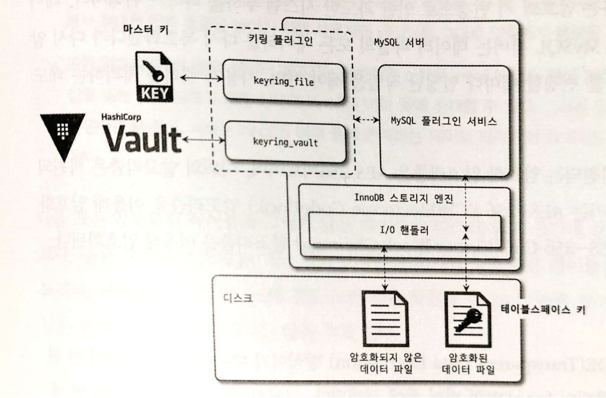 ๋์คํฌ <-> MySQL ์๋ฒ ์ฌ์ด์์ ์ํธํ ๋ฐ ๋ณตํธํ๊ฐ ์ด๋ฃจ์ด์ง๋ค๊ณ ์๊ฐํ๋ฉด ๋๋ค. ์ฆ ๋์คํฌ ์ ์ถ๋ ฅ์ ๋ด๋นํ๋ InnoDB ์คํ ๋ฆฌ์ง ์์ง์ I/O ๋ ์ด์ด์์ ์ํธ & ๋ณตํธํ๊ฐ ์งํ๋๋ค.