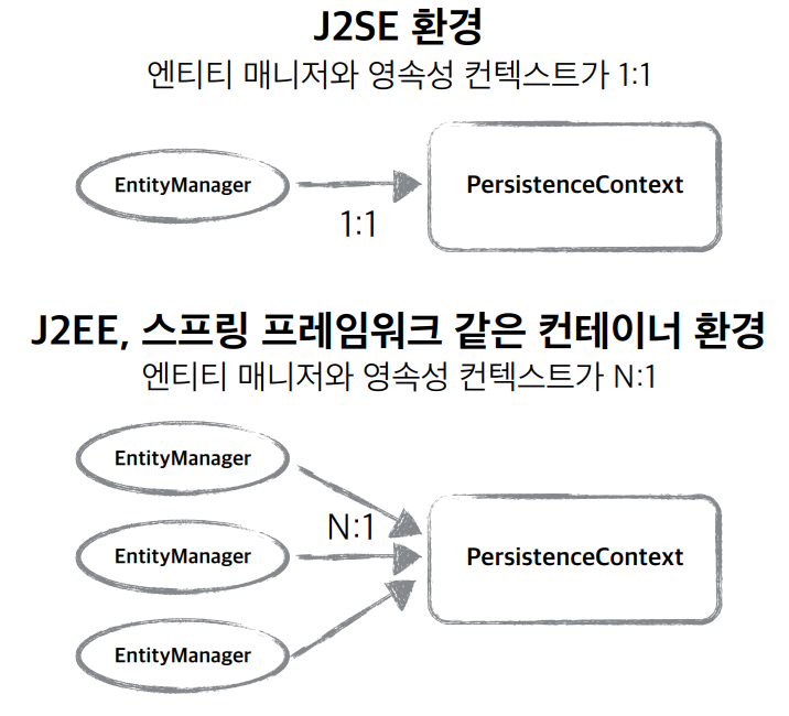 ์ฐธ๊ณ ๋ก ์์ ์์๋ EntityManager๋น ๊ณ ์ ํ ์์์ฑ ์ปจํ ์คํธ๋ฅผ ๊ฐ์ง๊ณ ์์์ง๋ง, ์คํ๋ง ํ๋ ์์ํฌ๋ฑ์ ์ฌ์ฉํ ๋์๋ ์ฌ๋ฌ ๊ฐ์ EntityManager๊ฐ ํ๋์ ์์์ฑ ์ปจํ ์คํธ๋ฅผ ๊ณต์ ํด์ ์ฌ์ฉํ ์๋ ์๋ค.