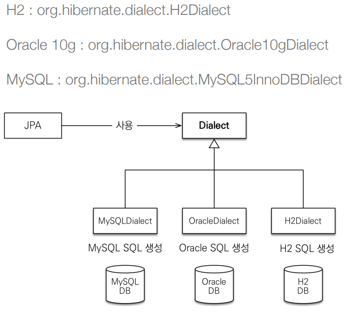 org.hibernate.dialect ๋ฅผ ์ฌ์ฉํ๋ฉด ๋๋ค. JPA์ DB์ ์์กด์ฑ์ ์ต์ํ ํ ์ ์๋ค.
