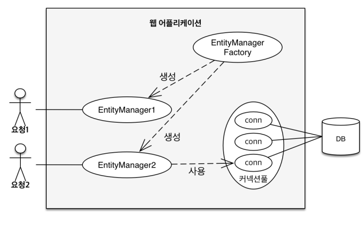 ์ฝ๋๋ฅผ ๋ณด๋ฉด ์๊ฒ ์ง๋ง, EntityManager๋ ๋ฐ์ดํฐ๋ฒ ์ด์ค Connection์ฒ๋ผ ์ฌ์ฉ๋๋ค.