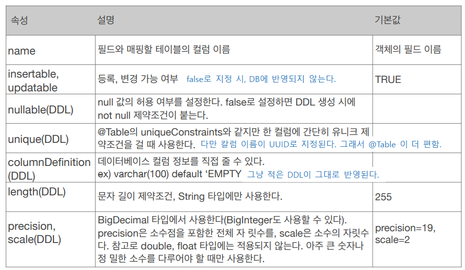 ํ๋์ ์นผ๋ผ์ ๋งค์นญํ ๋ ์ฌ์ฉํ๋ค. @Column์ ์ด์ฉํด์ ์ ์ฝ์กฐ๊ฑด์ ์ถ๊ฐํ ์ ์๋ค.