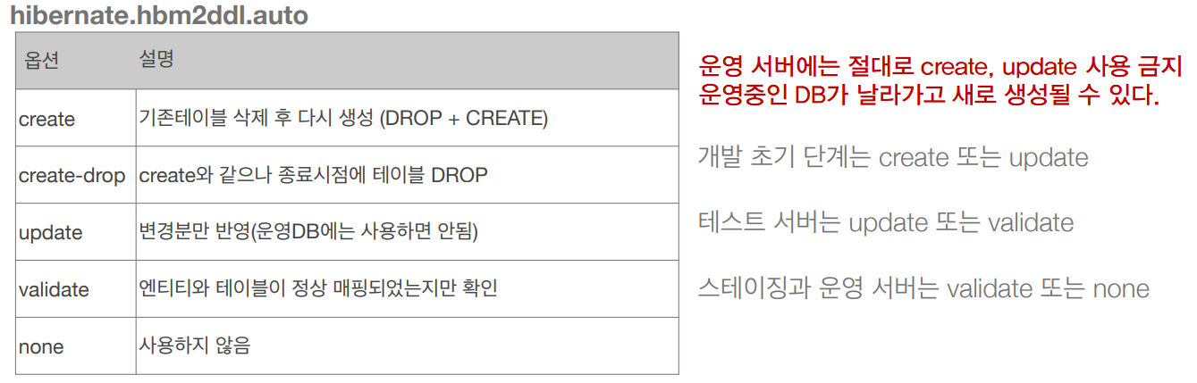 ์ ํ๋ฆฌ์ผ์ด์ ์คํ ์์ ์ @Entity๋ฅผ ์ฝ์ด DB์ DDL์ ๋ ๋ ค์ ํ ์ด๋ธ์ ์์ฑํ๋ค. ์๋ ์ต์ ์ผ๋ก ์ค์ ํ ์ ์๋ค.