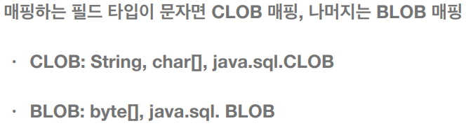 @Lob์ ๋ฐ๋ก ์ง์ ํ๋ ์ต์ ์ด ์๊ณ , ํ์ ์ด ๋ฌธ์๋ฉด CLOB, ๊ทธ ์ธ๋ BLOB ( ๋ฐ์ด๋๋ฆฌ )๋ก ์๋ ๋งคํ๋๋ค.