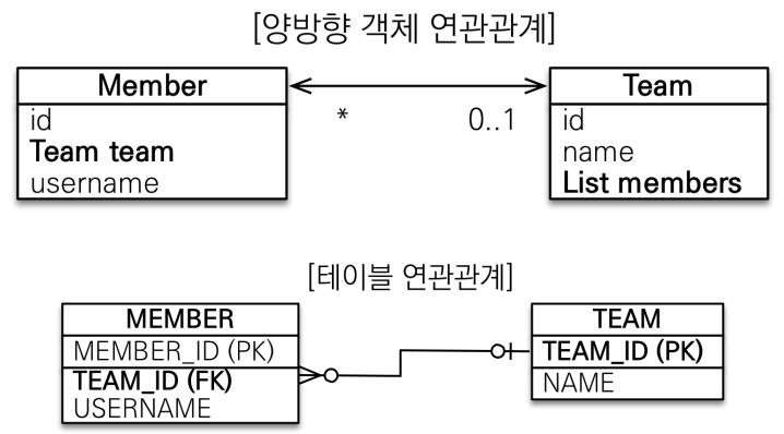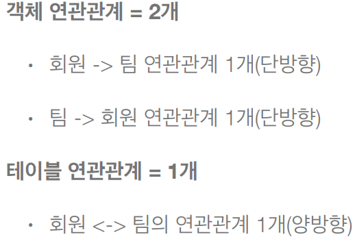 ๊ทธ ์ด์ ๋ ๊ฐ์ฒด๋ ์ฐธ์กฐ๋ฅผ 2๊ฐ๋ฅผ ๊ฐ์ง์ง๋ง, DB๋ ์ธ๋ํค 1๊ฐ๋ก ์๋ฐฉํฅ ์ฐธ์กฐ๊ฐ ๊ฐ๋ฅํ๊ธฐ ๋๋ฌธ์ด๋ค.