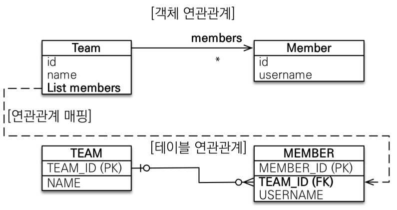 ๋น์ฆ๋์ค๋ ๊ฐ์ฒด๋ ์ด๋ฐ ์ผ์ด ๊ฐ๋ฅํ๋ค. ํ์ง๋ง DB๋ ์ค๊ณ์ ๋ถ๊ฐ๋ฅํ๋ค. Member(Many)์ชฝ์ ์ธ๋ํค๊ฐ ์์ ์ ๋ฐ์ ์๋ค. ์ฆ Team ๊ด๊ณ(์ธ๋ํค)๋ฅผ ๋ณ๊ฒฝํ๋ฉด ์๋ง์ Member์ UPDATE ์ฟผ๋ฆฌ๊ฐ ๋๊ฐ๊ฒ ๋๋ค.