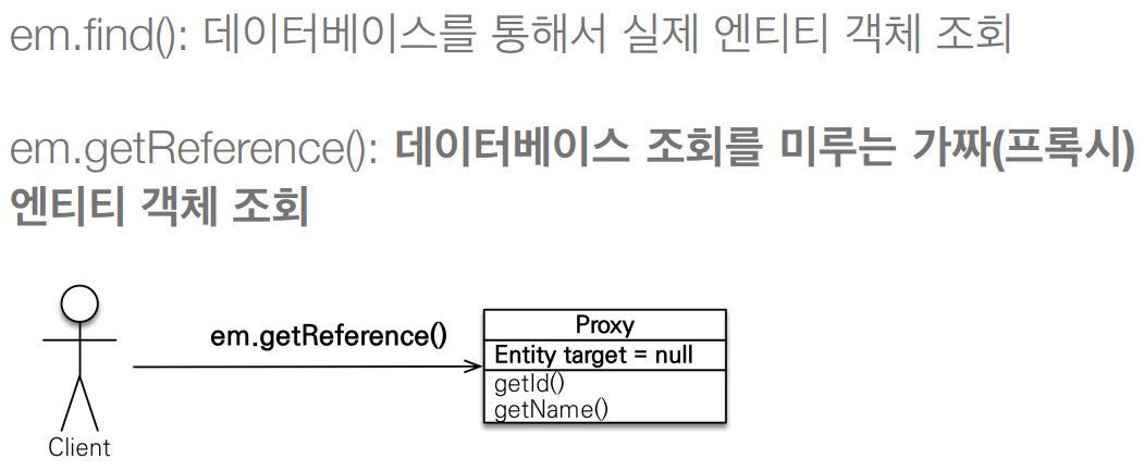 - em.getReference()๋ ๊ฐ์ง ํ๋ก์ ๊ฐ์ฒด๋ฅผ ๋ฐํํ๋ค.