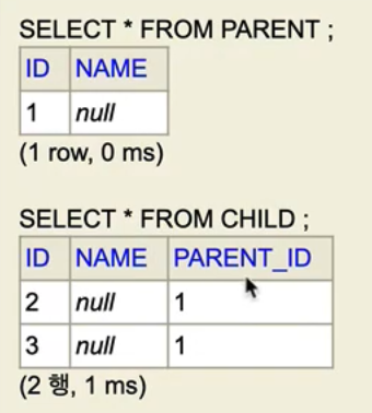 * ์ฐธ๊ณ ๋ก Parent๋ฅผ ํต์ผ๋ก ์ญ์ ํ๋ฉด cascade = REMOVE ์ฒ๋ผ ๋์ํ๋ค. ๋ชจ๋ ์์ ๊ฐ์ฒด๋ฅผ ์ญ์ ํ๋ค.