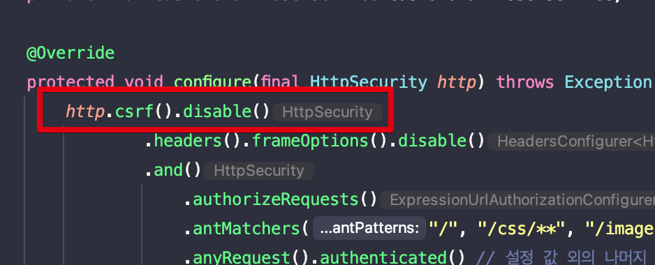 ๋์ค์ ์ธ๊ธํ ๊ฑฐ์ง๋ง, ์คํ๋ง ์ํ๋ฆฌํฐ (@EnableWebSecurity)๋ ๊ธฐ๋ณธ์ ์ผ๋ก CSRF ๊ณต๊ฒฉ๋ฐฉ์ด๋ฑ์ ๋ค์ํ ๋ณด์ ๊ธฐ๋ฅ์ ์ ๊ณตํ๋ค. ์ด๋ฐ๊ฒ๋ค๋ configure ์์ http ๊ฐ์ฒด๋ฅผ ํตํด ์ฝ๊ฒ ์ค์ ์ ๋ฐ๊ฟ ์ ์๋ค.