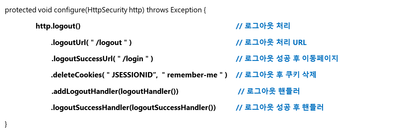 .and()// ๋ฌผ๋ก http.logout()์ผ๋ก ๋ฐ๋ก ์์ฑํด๋ ๋จ.