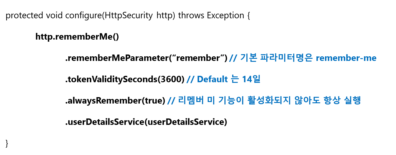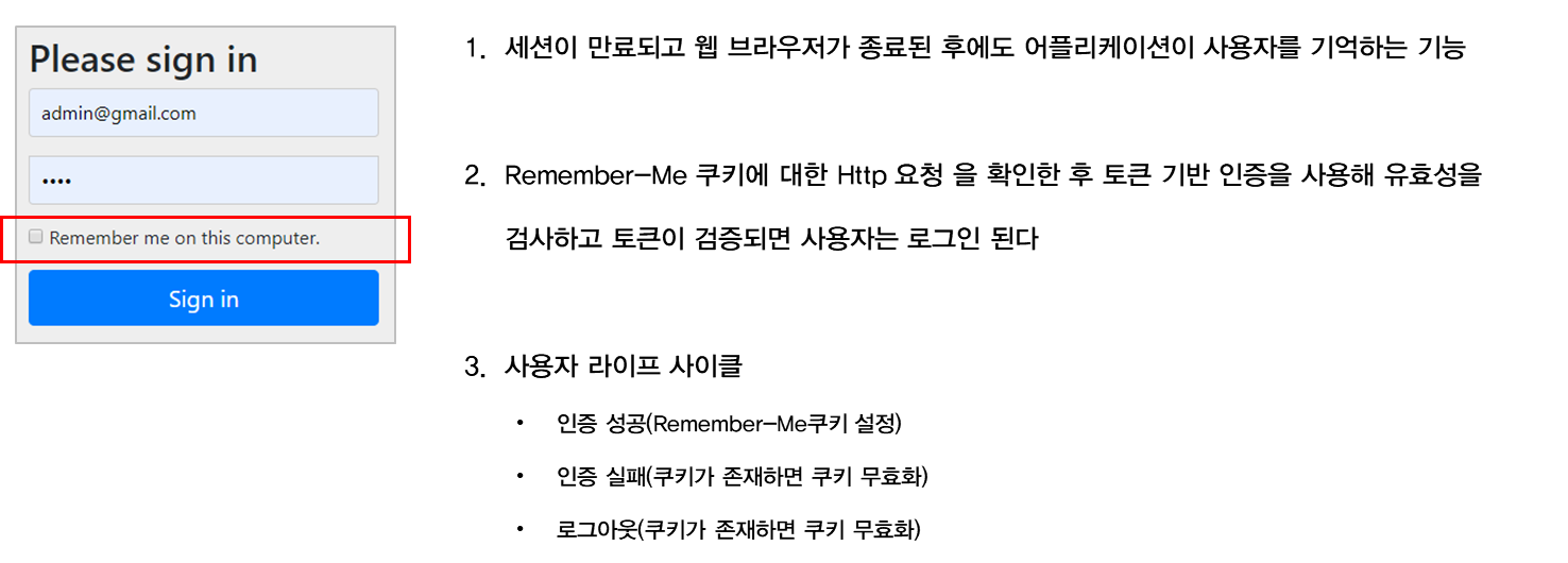 ํด๋น remeber-me ํ ํฐ์๋ [์ํธํ๋ UserID, Password]์ ๋ง๋ฃ์ผ์ด ์ ํ์๋ค.
