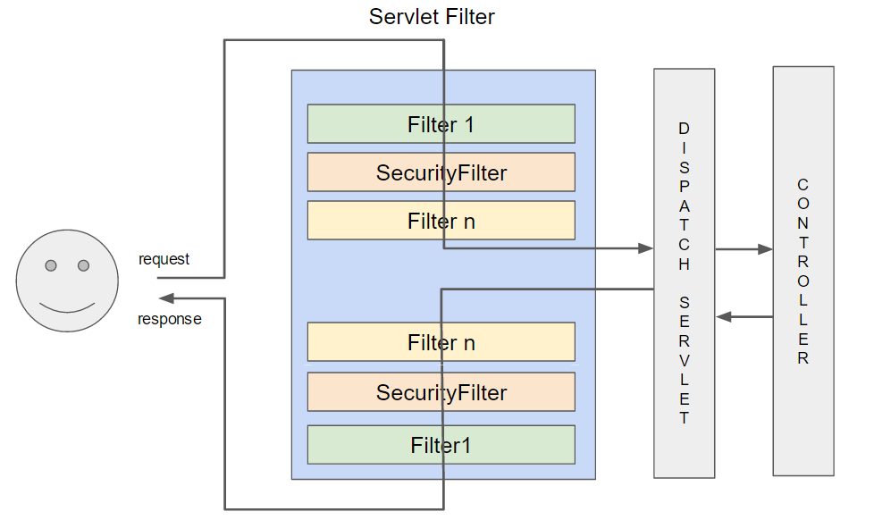 ๊ธฐ๋ณธ์ ์ผ๋ก ์๋ฐ ์๋ธ๋ฆฟ ํํฐ์ ๊ฒฝ์ฐ, FilterChain์ ๊ตฌ์ฑํ์ฌ ์๋ธ๋ฆฟ์ด ์คํ๋๊ธฐ ์ ํํฐ๋ฅผ ๊ฑฐ์น๊ฒ ๋๋ค.