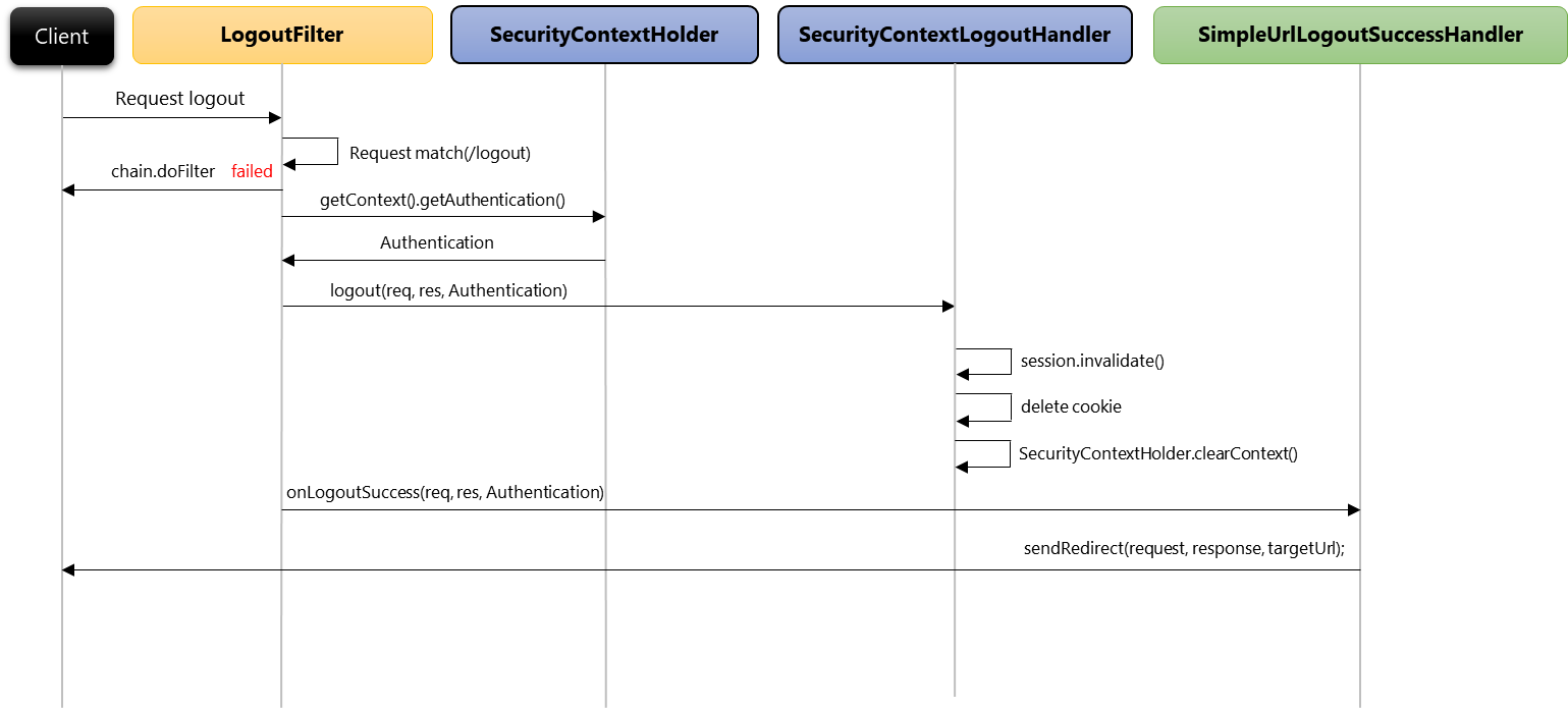 ๋ก๊ทธ์์๋ LogoutFilter๋ฅผ ํตํด ๋์ํ๋ค.