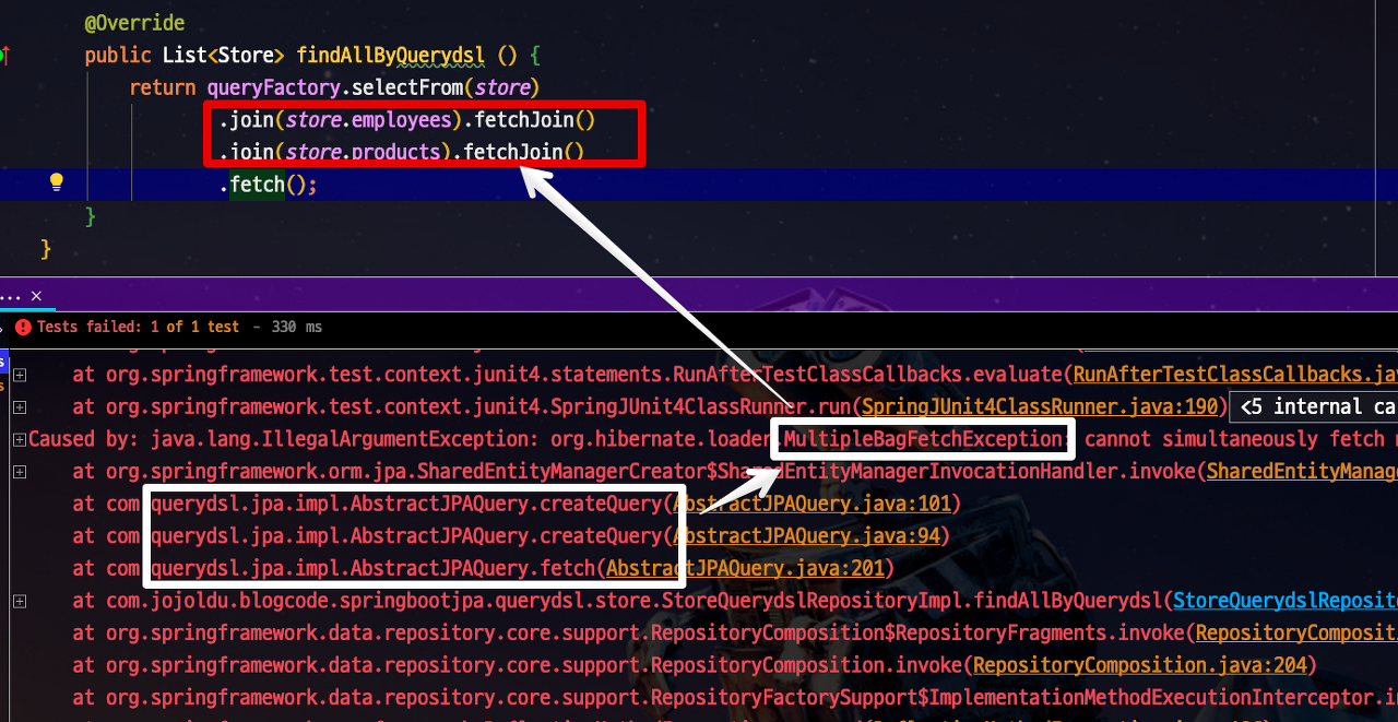 ์ค์ ๋ก ํ์ด๋ฒ๋ค์ดํธ์ 2๊ฐ์ด์์ ํจ์น์กฐ์ธ(entity -> toMany -> toMany)์ ์๋ํ๋ฉด `MultipleBagFetchException` ๋ฐ์์ํจ๋ค.