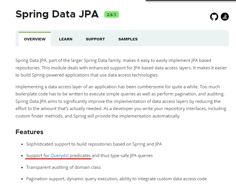 ์ฌ๋ฐ๋ ์ ์ Spring ๊ณต์๋ฌธ์์์๋ Predicate(JPA Criteria)๋ ์ธ๊ธ๋ ์๋๋ฐ, JPA + QueryDSL ์ง์์ ๊ฐ์กฐํ๊ณ ์๋ค.