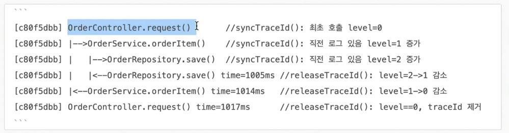 TraceStatus status = trace.begin("OrderController.request()"); // ๋ก๊ทธ ์์