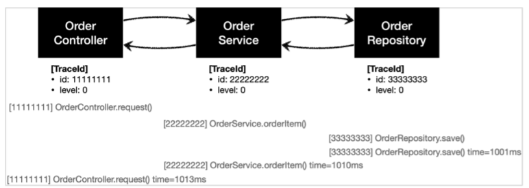 4. ๊ฐ ๋ฉ์๋๋ณ๋ก TraceId๋ฅผ ์ง์ ํ๋ค. ์ด๋ค ๋ฉ์๋๊ฐ ํธ์ถ๋์๋์ง, ํธ์ถ ์คํ(Level)์ ๋ก๊ทธ์ ๋จ๊ธด๋ค.