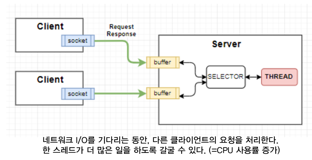 ๊ธฐ์กด์ ์๋ฐ๋ ๋ธ๋กํน I/O๋ง ๊ฐ๋ฅํ์๋ค. ๊ทธ๋์ ๋ฉํฐ์ค๋ ๋ ์ํฉ์์ I/O ๋๋ฌธ์ ์ค๋ ๋๊ฐ ๋ฉ์ถ๋ ์ผ์ด ๋ง์๋ค.