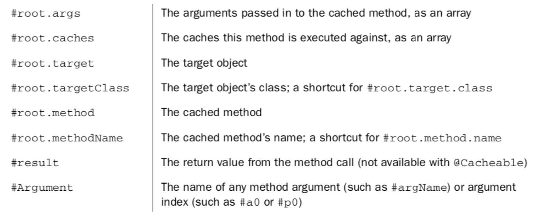 ์กฐ๊ฑด์ ๋ฐ๋ผ ์บ์๋ฅผ ๋ค๋ฅด๊ฒ ๋์ํ๊ฒ ํ๊ฑฐ๋, ์บ์ key๋ฅผ ์ง์ ํ๊ณ ์ถ๋ค๋ฉด SPEL ๋ฌธ๋ฒ์ ์ฌ์ฉํ์ฌ ์ค์ ํ ์ ์๋ค.