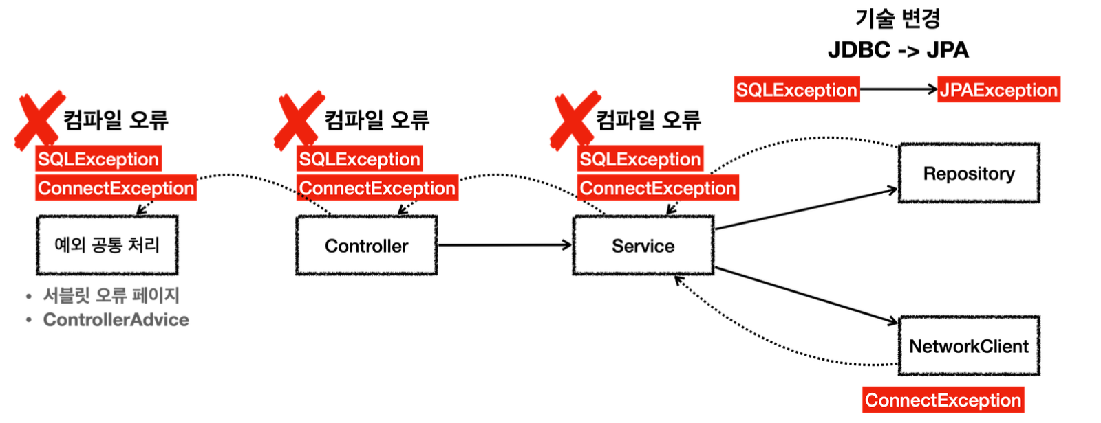 JDBC ๊ด๋ จ ์ฝ๋๋ฅผ ์จ๊ธฐ๋ ค๊ณ ํด๋, Transaction ์ค์ ๋ฐ ๋๊ธฐํ ๋๋ฌธ์ ๊ฐ์ ๋ก ์๋น์ค์ฝ๋์ ์์ด๊ฒ ๋ฉ๋๋ค. - JDBC์ `throws SQLException` ์ ์ด๋๊ฐ์์ ์ง์ ์ฒ๋ฆฌํด์ผํฉ๋๋ค.
