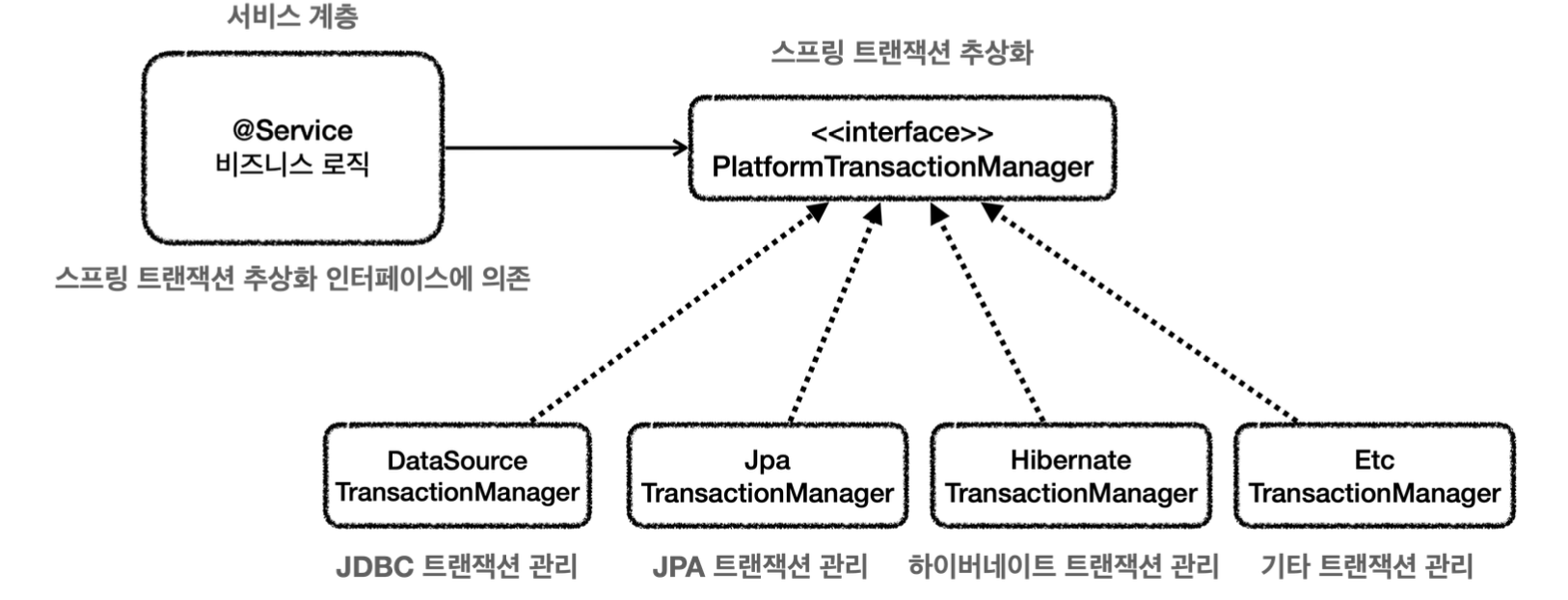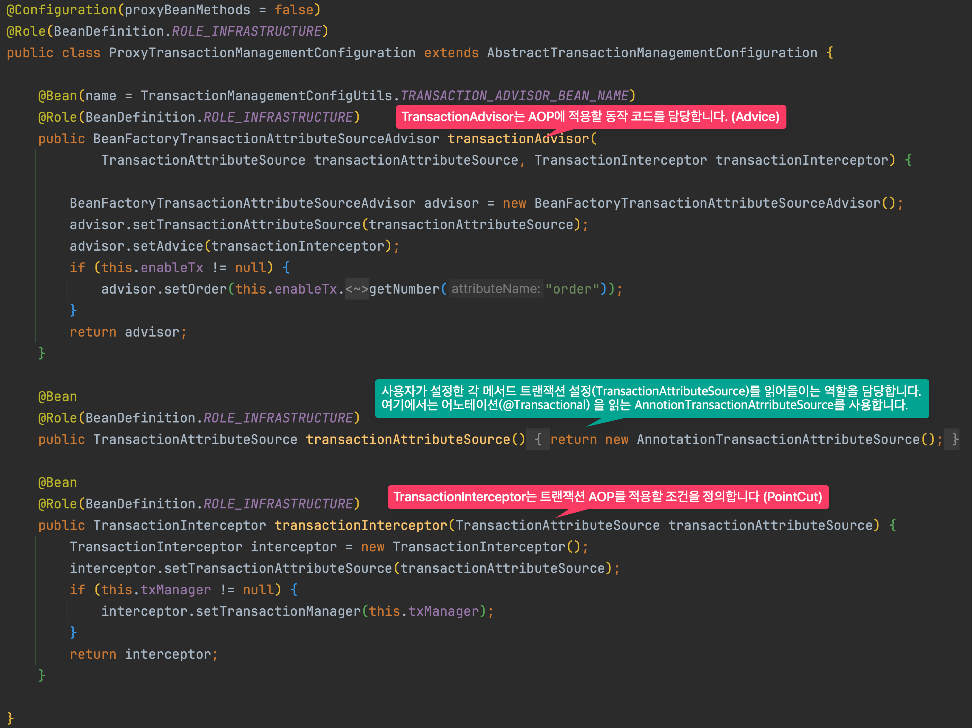 ํด๋น ๋ฌธ์ ๋ค์ ํด๊ฒฐํ๊ธฐ์ํด ์คํ๋ง์์ ํธ๋์ญ์ ์ ์๋์ ๊ฐ์ด ์ถ์ํ ํด๋์์ต๋๋ค.