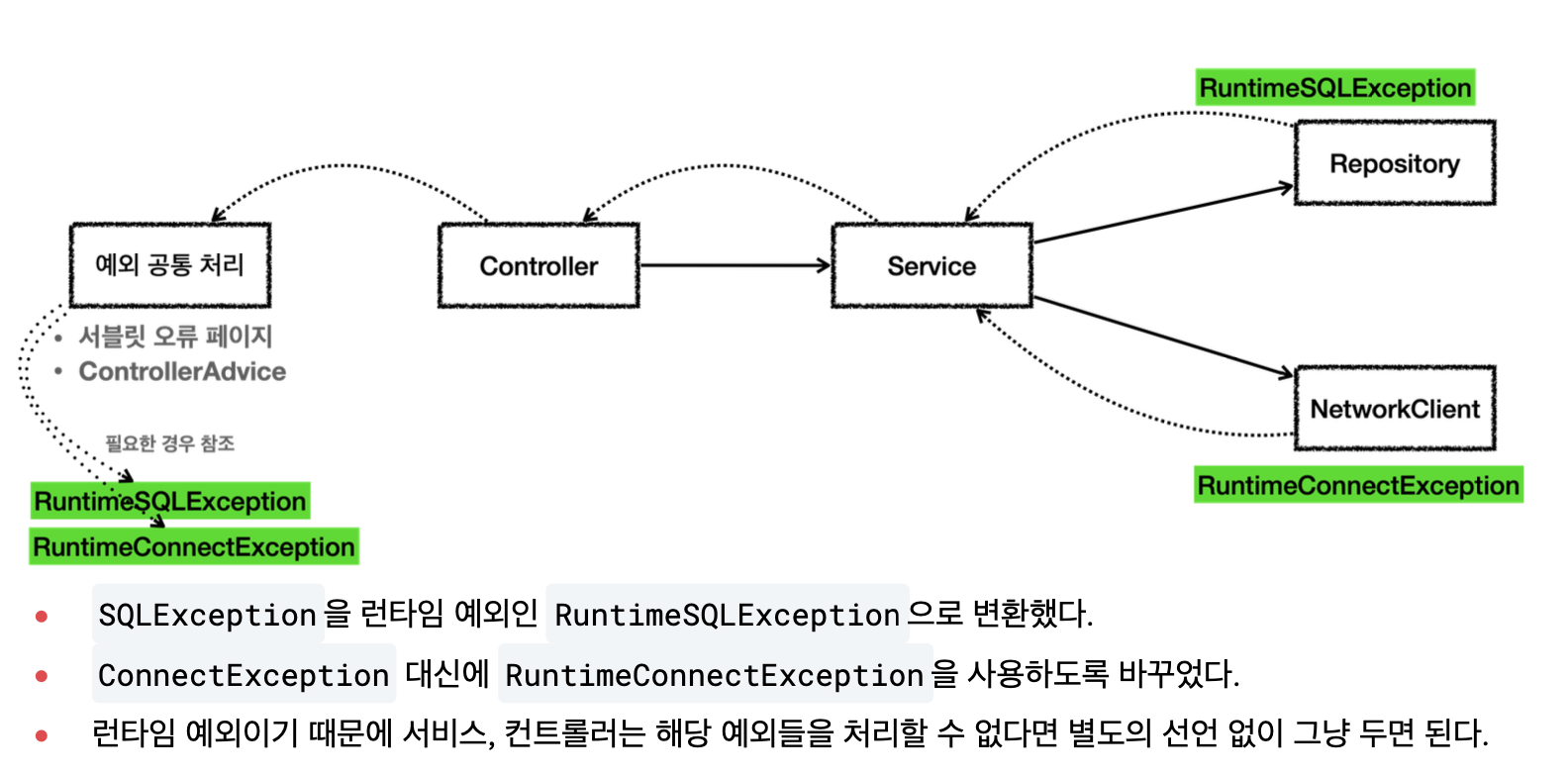 ๋จ์ํ ์ค๋ช ๋ง ๋ค์ผ๋ฉด RuntimeException์ ์ฌ์ฉํ์ง์๊ณ , ์ ๋ถ ์ฒดํฌ ์์ธ (throws ๋ก ๋ช ์ํ๊ณ try-catch๊ฐ ๊ฐ์ ๋๋ ์์ธ)๋ฅผ ์ฌ์ฉํ๋ฉด ํธํ ๊ฒ ๊ฐ์ง๋ง, ํน์ Exception ๊ฐ์ฒด์ ์์กด์ฑ์ด ์๊ธฐ๊ฒ๋๊ณ ์ฝ๋ ์์ฒด๊ฐ ๋๋ฌ์์ง๋ค.