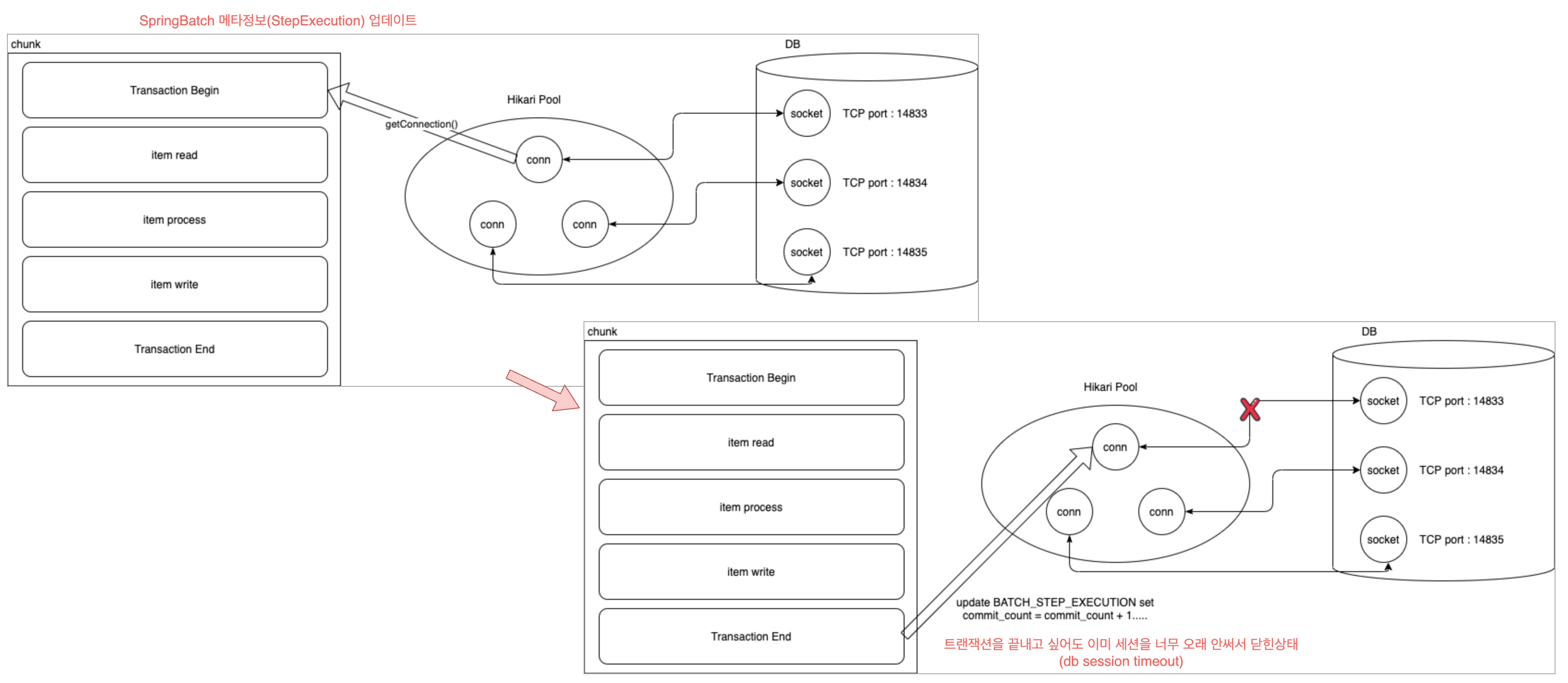 - chunk ๋จ์ ์์ ์์ ์, ํธ๋์ญ์ ์์ฑ์ผ๋ก ์ธํด HikariCP ์์ ์ปค๋ฅ์ ์ ํ๋ํฉ๋๋ค.