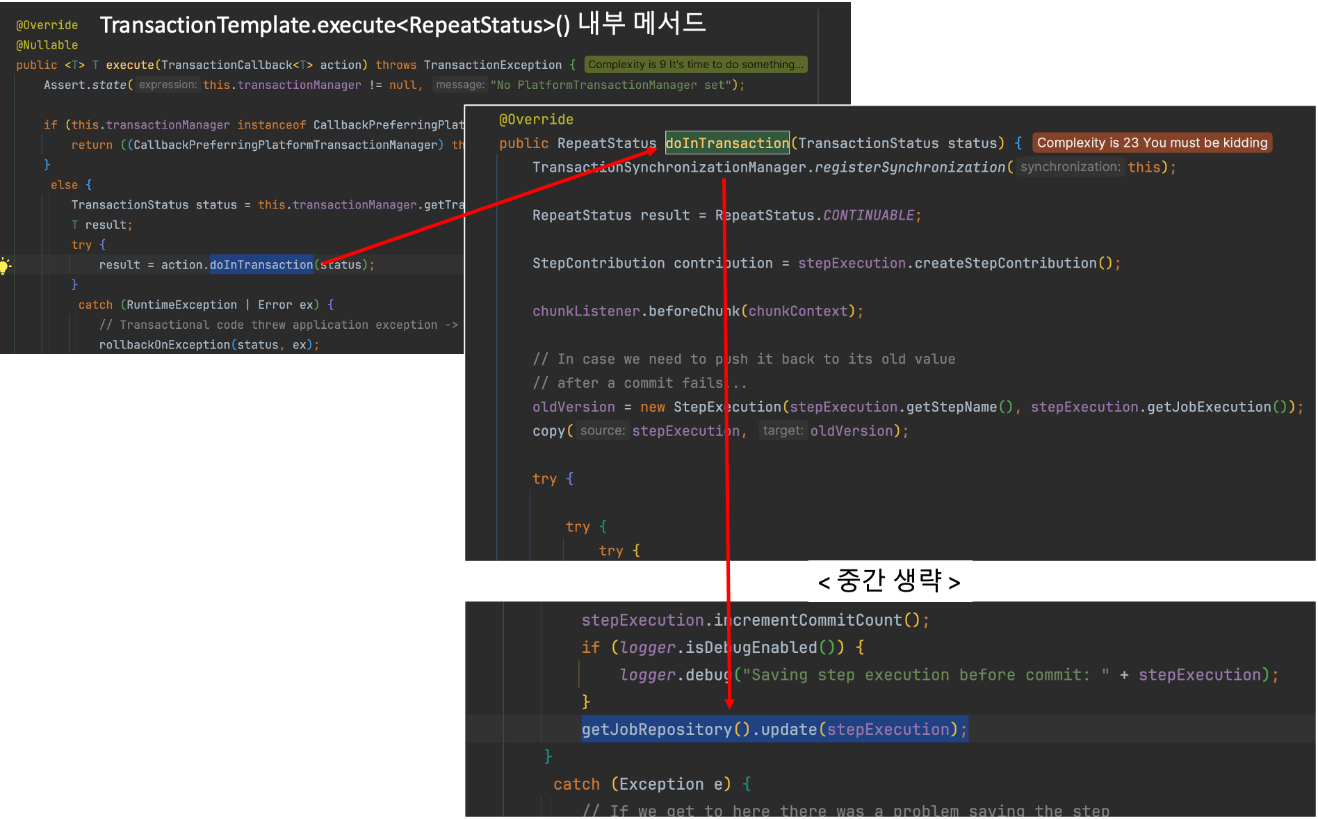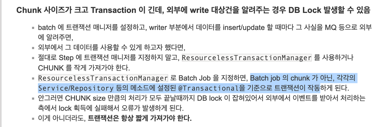 - ๋ณต์กํ ๋ฐฐ์น ์์ ์ TransactionCallback์ ์ฌ์ฉ ์ ๋ฐ๋๋ฝ์ด ๊ฑธ๋ฆฌ๋ ์ด์๊ฐ ์์ด์ ์ฒญํฌ๋จ์๋ก ํธ๋์ญ์ ์ ์ก์๊ฑฐ๊ธฐ๋ ํ๋ค.