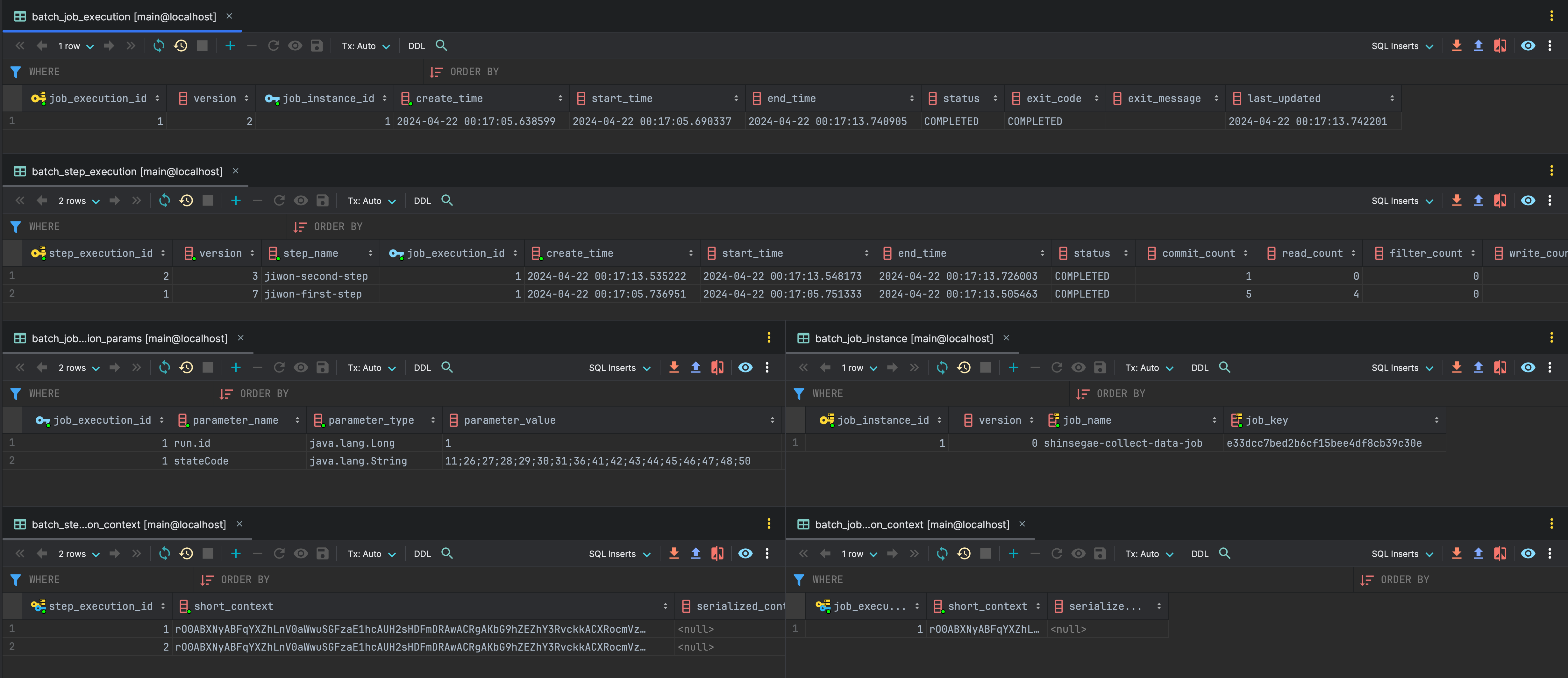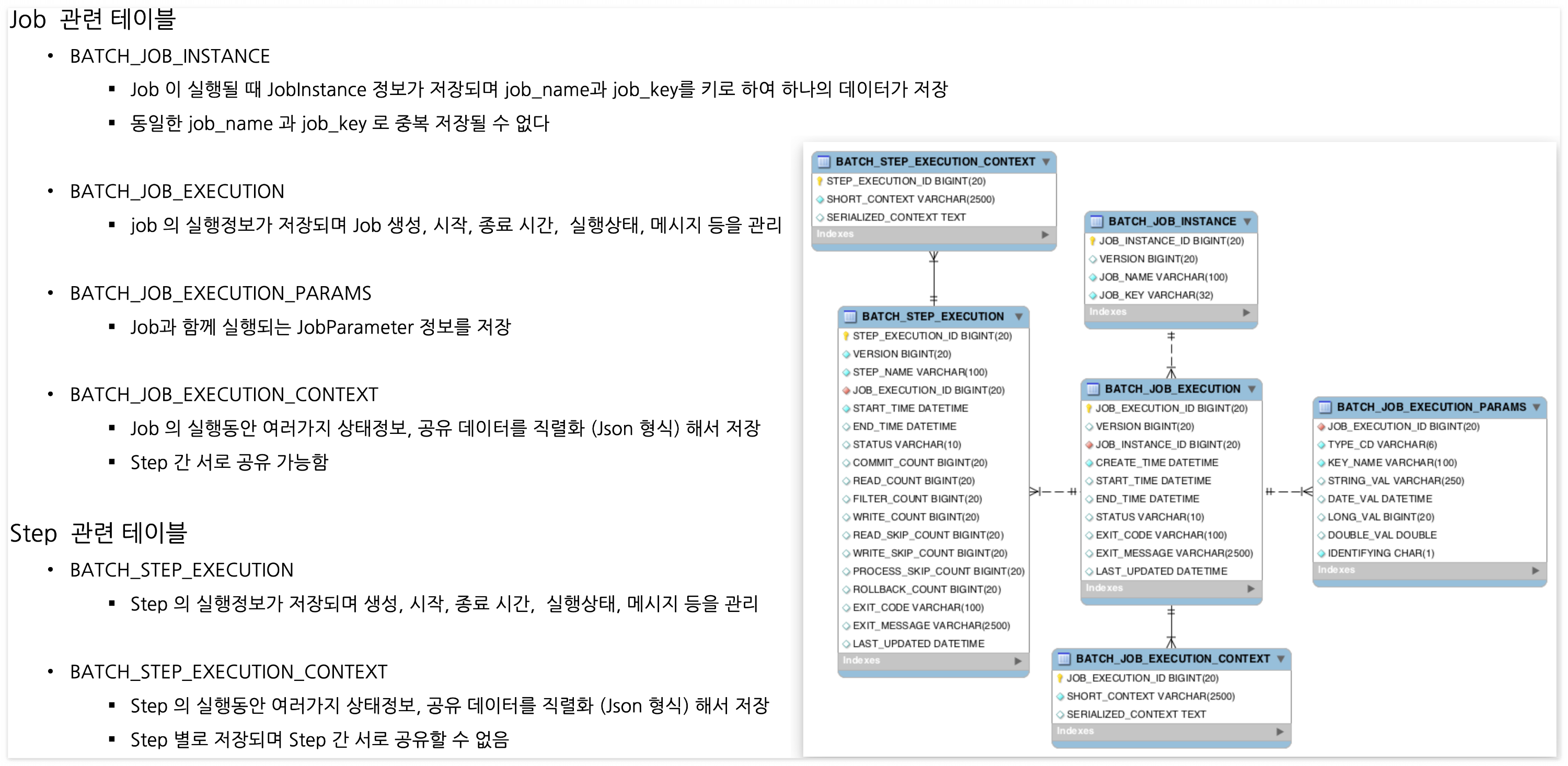 - BATCH_STEP_EXECUTION : STEP ์คํ์ ๋ณด - job_execution_id, ๋ฐ์ดํฐ read, commit, filter, skip count, step ์๋ฌ์ ๋ณด