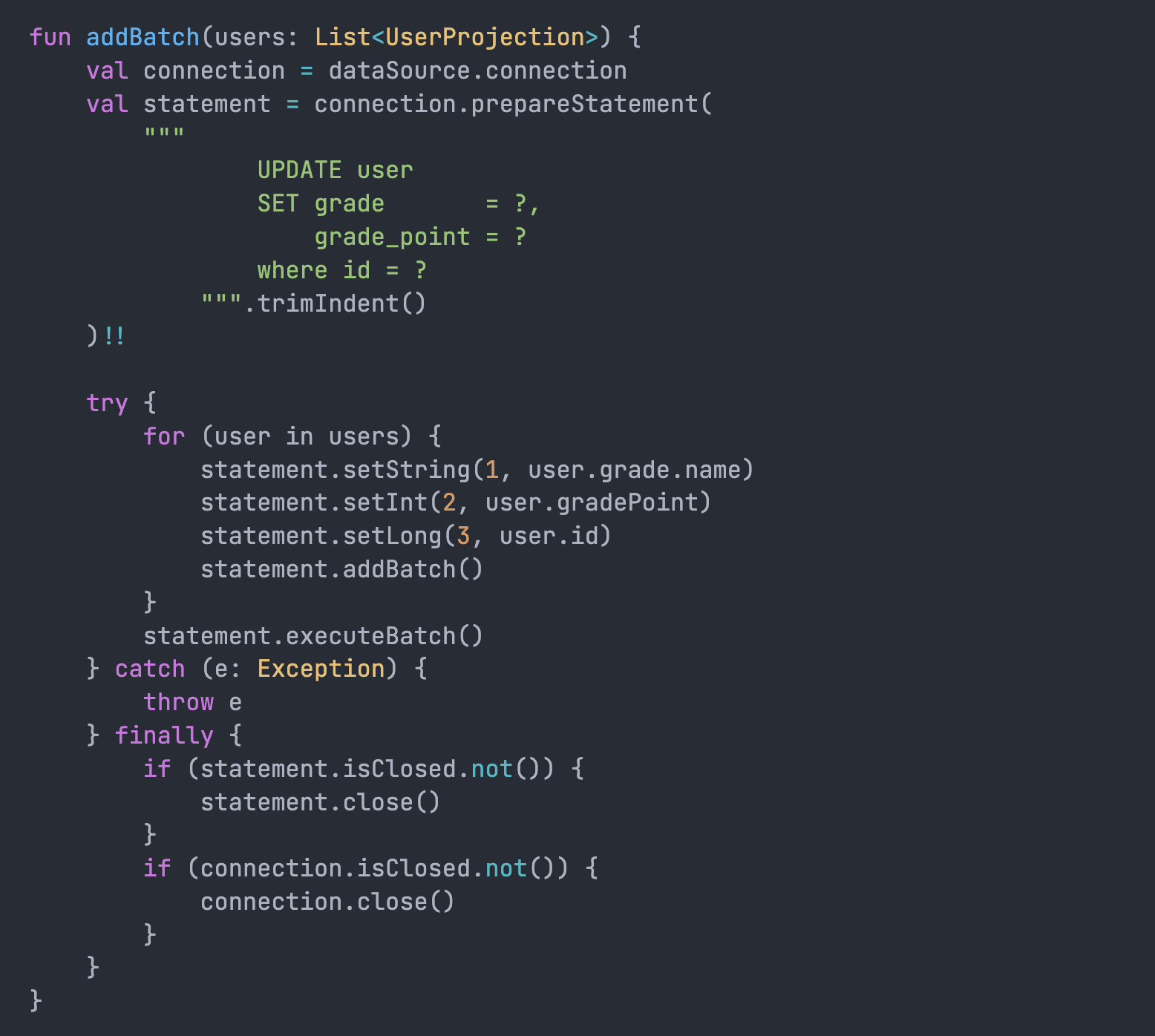 - update ์์ ์์ฒด๊ฐ ๋ง์์ ๋ณ๊ฒฝ์ด ํ๋ค๋ค๋ฉด DB I/O ์์ ์ ๋ฌถ์ด์ ์ฒ๋ฆฌํ๋ jdbc executeBatch๋ฅผ ํ์ฉํ ์๋ ์๋ค.