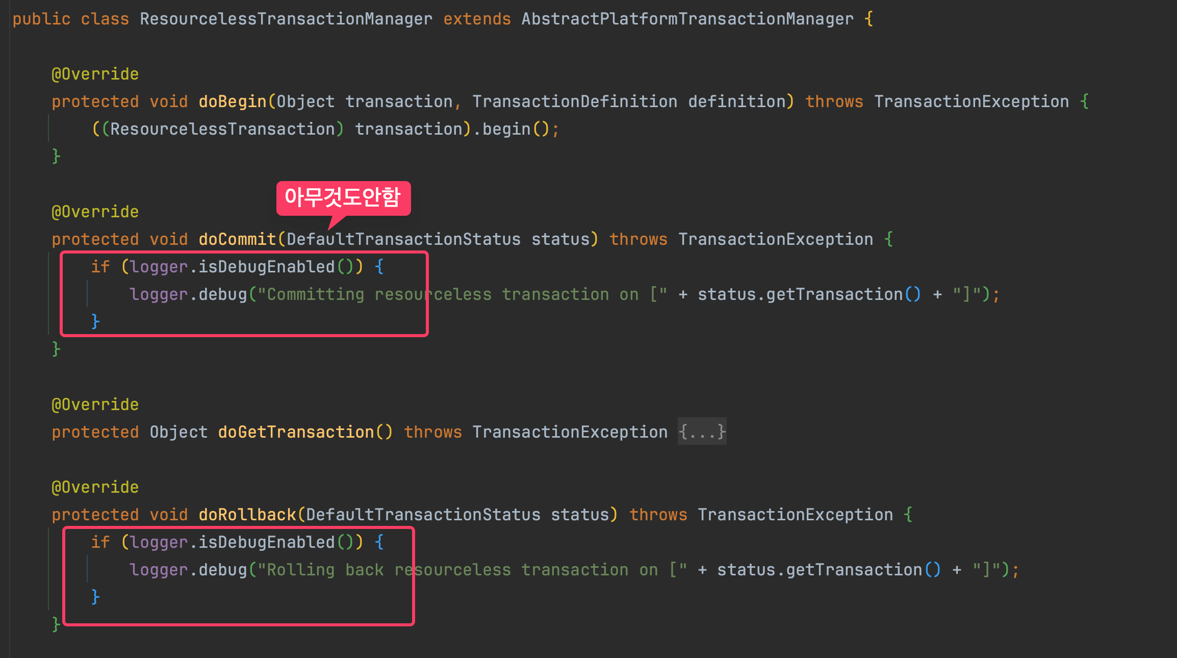 ๋ง ๊ฑธ์ง ์์ ๋ฟ์ด๋ค. ResourceLessTxManager ์ฝ๋๋ฅผ ์ด์ด๋ณด๋ฉด ์ดํด๊ฐ ์ฌ์ธํ