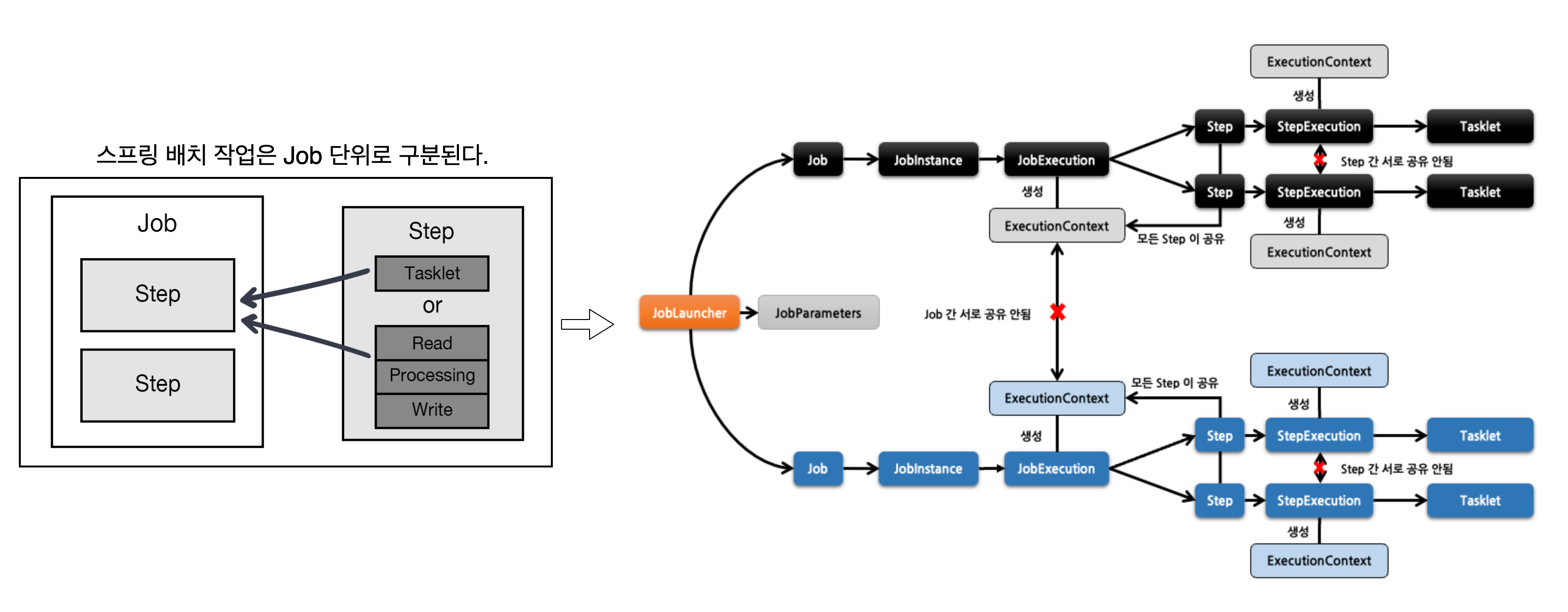 ์คํ๋ง ๋ฐฐ์น๋ Job ๋จ์๋ก ์คํ๋ฉ๋๋ค. ํ๋์ Job์ ์ฌ๋ฌ Step์ผ๋ก ๋๋ ์ ์๋ค.