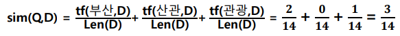 sim(Q,D) = tf(๋ถ์ฐ๊ด,D)+tf(์ฐ๊ด๊ด,D)