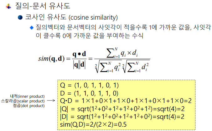 cos(Q,D1) = (1*1) + (1*0) / (sqrt(2) * sqrt(3))
