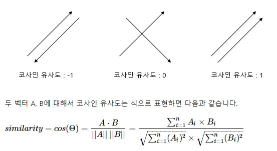 ์ฝ์ฌ์ธ ์ ์ฌ๋๋ ๋ ๋ฒกํฐ ๊ฐ์ ์ฝ์ฌ์ธ ๊ฐ๋๋ฅผ ์ด์ฉํ์ฌ ๊ตฌํ ์ ์๋ ๋ ๋ฒกํฐ์ ์ ์ฌ๋๋ฅผ ์๋ฏธํฉ๋๋ค. ๋ ๋ฒกํฐ์ ๋ฐฉํฅ์ด ์์ ํ ๋์ผํ ๊ฒฝ์ฐ์๋ 1์ ๊ฐ์ ๊ฐ์ง๋ฉฐ, 90°์ ๊ฐ์ ์ด๋ฃจ๋ฉด 0, 180°๋ก ๋ฐ๋์ ๋ฐฉํฅ์ ๊ฐ์ง๋ฉด -1์ ๊ฐ์ ๊ฐ๊ฒ ๋ฉ๋๋ค. ์ฆ, ๊ฒฐ๊ตญ ์ฝ์ฌ์ธ ์ ์ฌ๋๋ -1 ์ด์ 1 ์ดํ์ ๊ฐ์ ๊ฐ์ง๋ฉฐ ๊ฐ์ด 1์ ๊ฐ๊น์ธ์๋ก ์ ์ฌ๋๊ฐ ๋๋ค๊ณ ํ๋จํ ์ ์์ต๋๋ค. ์ด๋ฅผ ์ง๊ด์ ์ผ๋ก ์ดํดํ๋ฉด ๋ ๋ฒกํฐ๊ฐ ๊ฐ๋ฆฌํค๋ ๋ฐฉํฅ์ด ์ผ๋ง๋ ์ ์ฌํ๊ฐ๋ฅผ ์๋ฏธํฉ๋๋ค.