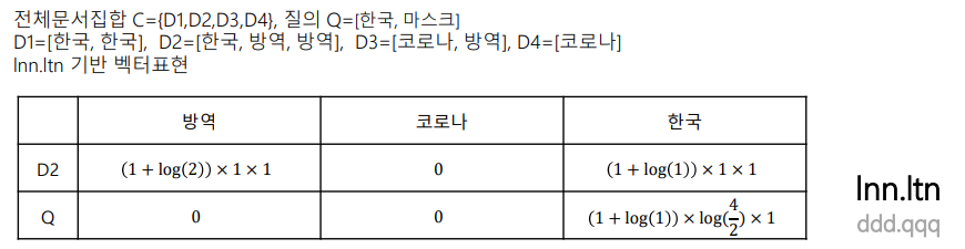 ๋ฌธ์ ๋ฒกํฐ lnn์ ๊ณต์ $ ( 1+log(tf) ) * 1 * 1 $