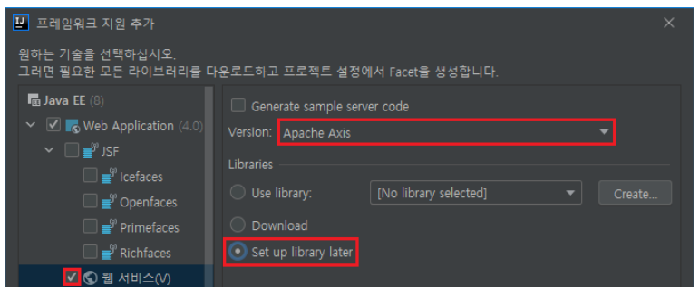 intellJ๋ฅผ ์ค์นํด์ ๋น ์๋ฐ ํ๋ก์ ํธ๋ฅผ ๋ง๋ ํ JavaEE ์น ์๋น์ค ํ๋ ์์ํฌ๋ฅผ ์ถ๊ฐํ๋ฉด ๋๋ค.