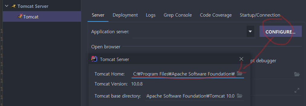 ๊ทธ๋ฆฌ๊ณ IntelliJ์ ์ค์นํ ํฐ์บฃ์ ์ฐ๊ฒฐํ์.