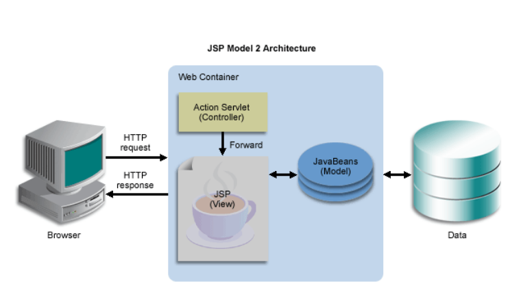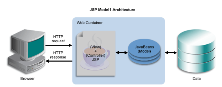 ๋จ ํ๋์ ์๋ธ๋ฆฟ๋ง์ ์ฌ์ฉํ์ฌ ํด๋ผ์ด์ธํธ์ ์์ฒญ์ ์๋ฐ ์ฝ๋๋ค๋ก ์ฒ๋ฆฌํ๊ณ , View ์ ํด๋นํ๋ ์ฝ๋๋ง JSP์ ๋จ๊ธด๋ค. ์ฝ๊ฒ ๋งํด [ ์๋ธ๋ฆฟ(Controller) ] - [ ์๋ฐ ํด๋์ค, JavaBean(Model) ] - [ JSP ํ์ด์ง(View) ]๋ฅผ ๋ถ๋ฆฌํด์ ๊ฐ๋ฐํ๋ ๋ฐฉ๋ฒ.