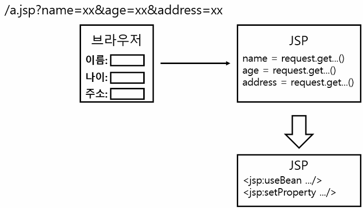๋ธ๋ผ์ฐ์ ์ ํ์ด์ง ์์ฒญ์ด ๋ค์ด์ค๋ฉด [JSP ํ์ด์ง]์์ ์ฌ์ฉ๋๋ JavaBean์ด๋ ๋ฐ๋ก ์์ฑํ ํด๋์ค๋ฅผ ์ด์ฉํ์ฌ WAS์์ ์๋ธ๋ฆฟ์ ์์ฑ, ๋ก์ง ์ฒ๋ฆฌ ํ ๊ฒฐ๊ณผ๋ฅผ ํด๋ผ์ด์ธํธ์ ์ ์กํ๋ค.